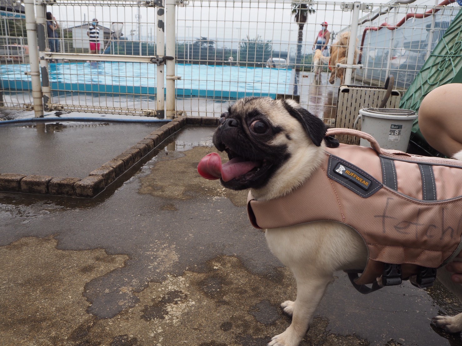 ちなみに、我が家のパグも犬用ライフジャケットを付けた状態でプールデビューしました!