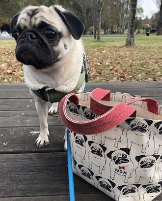 私調べですが、パグを飼っている方は、パグのデザインが入った「パグバック」を持っている方が多いような気がします。笑
